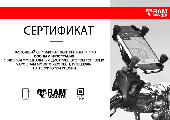 Продуманное и качественное крепление. Оно отлично держится на руле, навигатор в нем "сидит" очень крепко. Удобно, что при необходимости можно легко снять навигатор — на руле при этом останется только небольшое основание, которое в отсутствие навигатора совсем не мешает. Помимо самого крепления в комплекте есть всё необходимое для его установки: противоскользящая самоклеящаяся подкладка, винты и гайки, пластиковые стяжки. Можно установить как на сам руль, так и на его вынос.